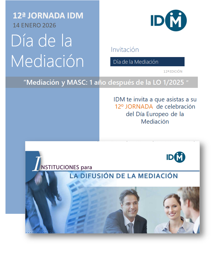 En IDM-Instituciones para la Difusión de la Mediación- os invitamos a participar en la 12ª JORNADA «Mediación y MASC: 1 año después de la LO 1/2025” que se llevará a cabo el miércoles 14 de enero de 2026, de 10:00-12.30, con motivo del Día de la Mediación.